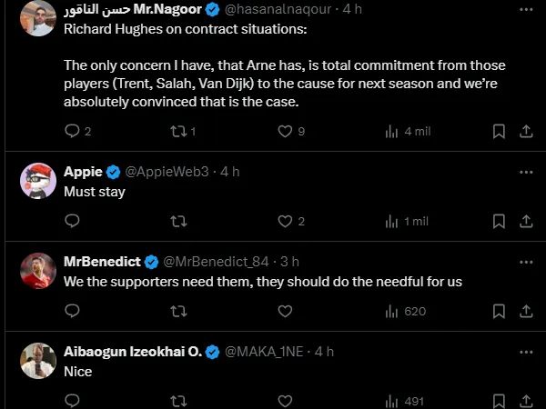“Esses são assuntos privados entre clube e jogadores. A única preocupação que eu e Arne (Slot) temos sobre as situações é o comprometimento total dos jogadores com a causa para a próxima temporada”, respondeu Hughes.