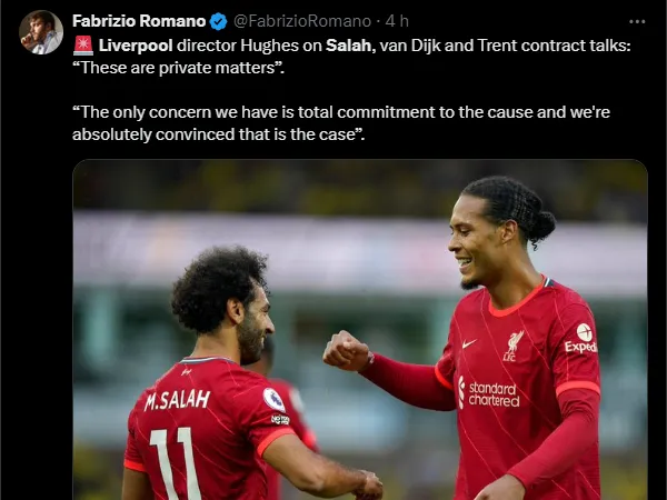 Richard Hughes, diretor de futebol do clube de Anfiled, preferiu dar poucos detalhes: “Sobre situações contratuais, não acho que seria justo eu falar sobre isso”, disse na apresentação de Arne Slot.