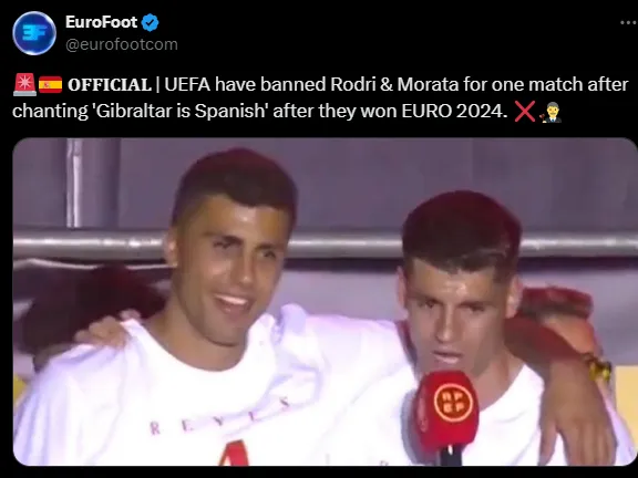 Junto com Morata, que também recebeu a punição, Rodri entoou cânticos “Gibraltar é espanhol”, na comemoração da Espanha após vencer a finalíssima da Euro 2024.