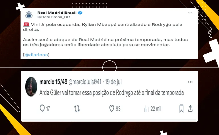 Desta forma, a tendência é de que o Real Madrid tenha um ataque formado por Rodrygo, Vinicius Júnior e Mbappé. No banco de reservas, nomes como os de Güler, Brahim e Endrick devem ser opções.