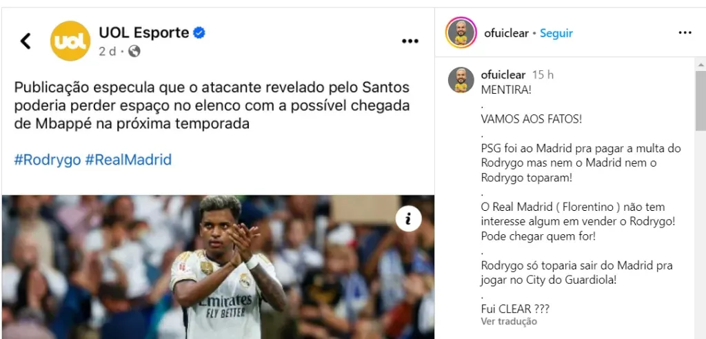 “O Real Madrid (Florentino) não tem interesse nenhum em vender o Rodrygo. Pode chegar quem for”, disse. “Rodrygo só toparia sair do Madrid pra jogar no (Man) City do Guardiola”, completa.
