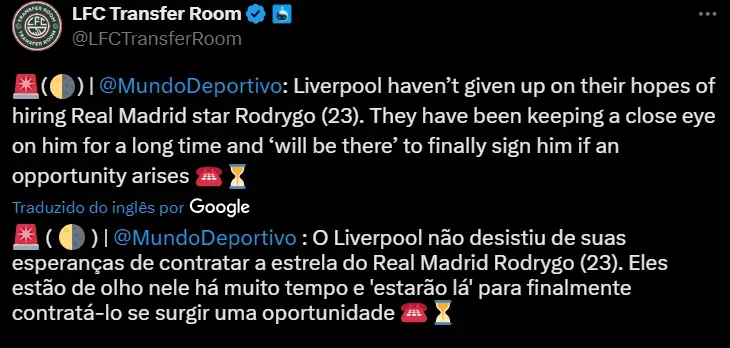 Segundo informações do jornal Mundo Deportivo, o Liverpool ainda não jogou a toalha por Rodrygo e está altamente interessado no jovem talento brasileiro. Um acordo, por tudo que foi dito, é difícil, mas os Reds seguirão monitorando o atleta do Real Madrid, cujo tem contrato em vigor na Espanha até 2029.