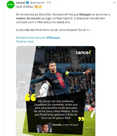 “Todos estão entusiasmados com Kylian Mbappé em Madrid. Ele é um jogador incrível e acho que vai se tornar um dos melhores do mundo. Será uma escolha muito boa para ele se for para o Real Madrid. Acredito que finalmente ganhará a Bola de Ouro se for para o Real”, afirmou Ronaldo.