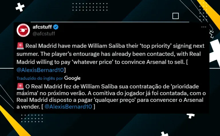 Florentino foi informado sobre a condição imposta por Saliba, e pretende tomar uma decisão até o final do ano. Atualmente, a zaga titular do Real Madrid é formada por Rudiger e Militão. Ou seja, a decisão requer muita cautela.