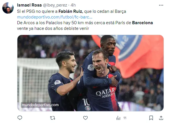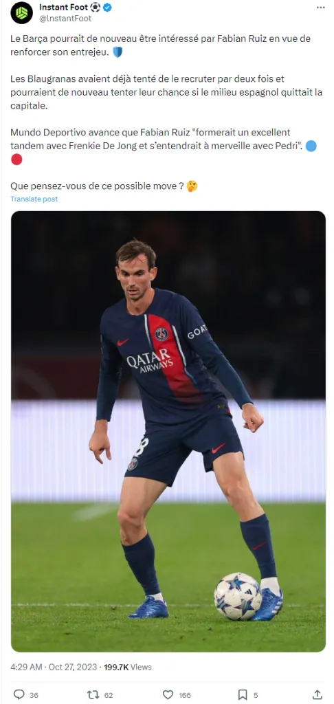 Diante das recentes críticas a espanhóis no PSG, Carlos Soler e Fabián Ruiz, o jornal Mundo Deportivo indica que o Barcelona pode buscar o atleta, cuja nacionalidade poderia agregar muito ao clube e resolver problemas de lesões na equipe nesta temporada.
