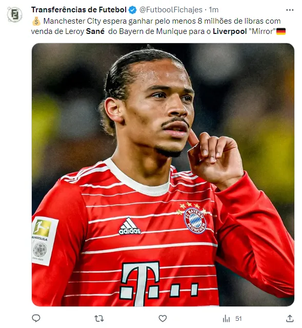 Atualmente, o valor de mercado de Sané é estimado em 65 milhões de euros, segundo dados do ‘Transfermarkt‘. O jogador de 27 anos possui contrato com o Bayern até 2025.