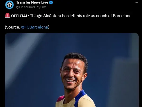 Thiago Alcântara está fora do Barcelona. Ele havia chegado para ser auxiliar do técnico Hansi Flick. O próprio treinador convidou o ex-atleta do Liverpool para a função.