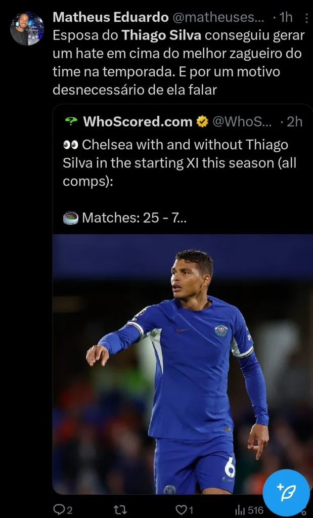 Diante de tudo isso, a esposa de Thiago Silva, a Belle, chegou a pedir a demissão do técnico Mauricio Pochettino nas redes sociais. O próprio treinador falou sobre o assunto em papo com o a imprensa do mundo todo.