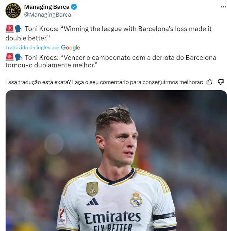 O alemão Toni Kroos, que está em negociações para renovar seu contrato com o Real Madrid, após pedido de Ancelotti, não deixou barato e provocou o Barcelona depois do clube merengue conquistar LaLiga e ir para à final da UCL.