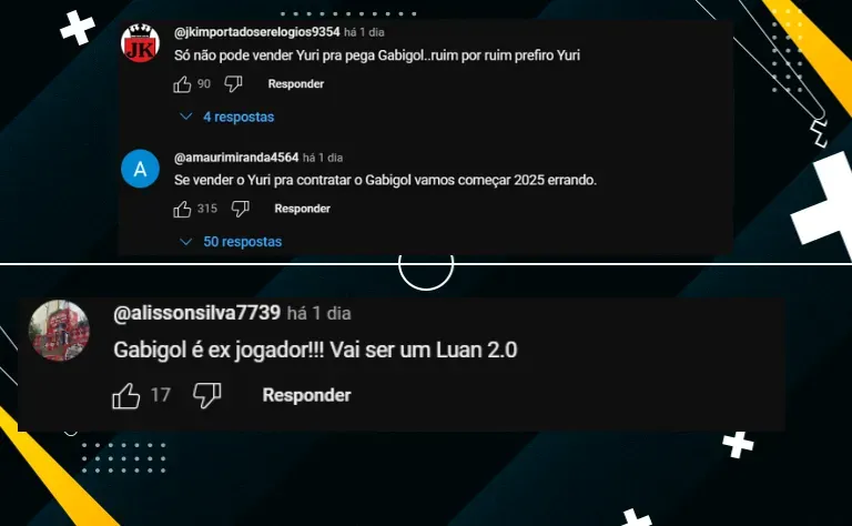 “Só não pode vender Yuri Alberto para pegar Gabigol. Ruim por ruim, eu prefiro o Yuri”, disse outro. “Gabriel é um ex-jogador, vai ser um Luan 2.0”, completa outro torcedor do Corinthians.