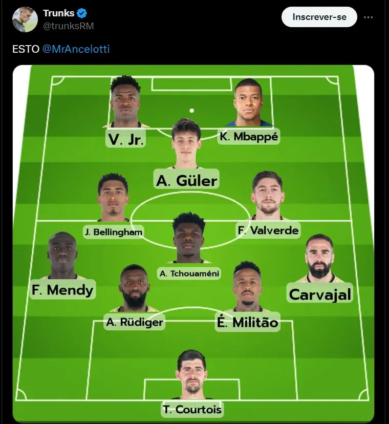 Com direito a recado para Ancelotti, os merengues jogariam em um esquema 4312, com Guler atuando por trás de Mbappé e Vinicius Jr, sem pontas, com Bellingham, Valverde e Tchouaméni no meio. “Assim, Ancelotti”, publicou o perfil.