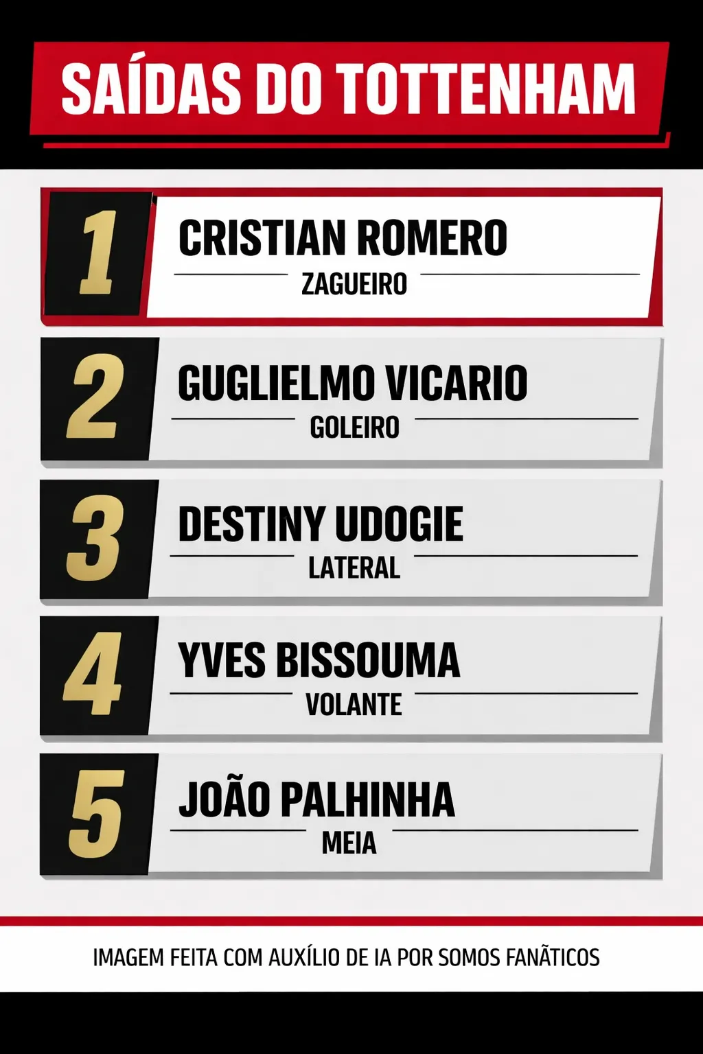 Outros nomes que estariam na “barca” de saídas são o goleiro Guglielmo Vicario, o lateral Destiny Udogie, o volante Yves Bissouma e ainda o meio-campista João Palhinha, que está emprestado pelo Bayern de Munique.