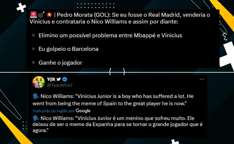 No entanto, mesmo diante da enorme temporada de Vinicius Jr, o jornalista Pedro Morata, conhecido por ser contra o clube merengue e também contra o jovem brasileiro, sugeriu um negócio envolvendo Nico Williams para o Real Madrid. A declaração do periodista causou revolta nos torcedores Los Brancos.