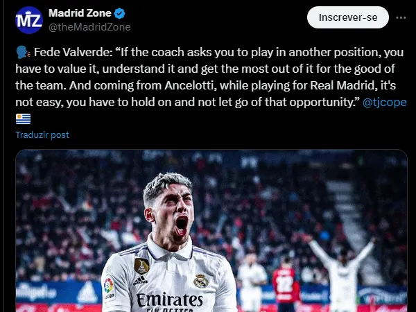 Sobre se adaptar no esquema de Carlo Ancelotti, Valverde analisa: “Se o treinador pede para você jogar em outra posição, você tem que valorizar, entender e tirar o máximo proveito para o bem da equipe”, disse.