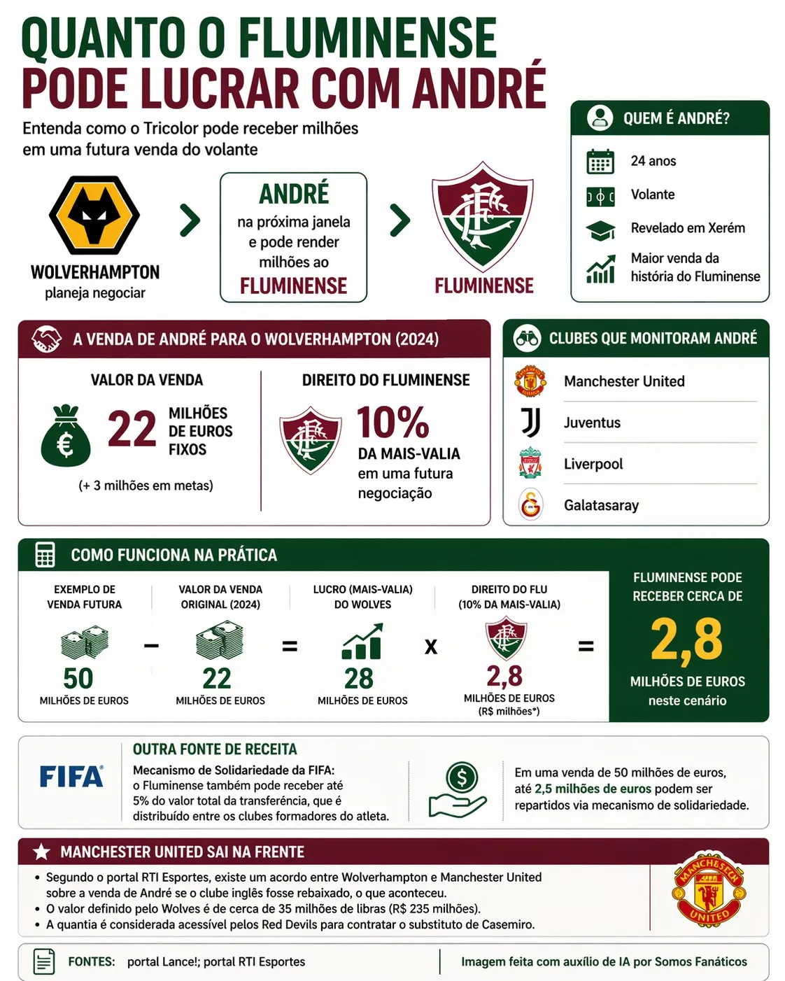 Assim, o clube carioca tem direito a uma fatia do valor excedente em relação à venda original. Caso o volante seja negociado, por exemplo, por 50 milhões de euros, o Fluminense teria direito a 10% sobre os 28 milhões de euros de lucro do Wolverhampton.