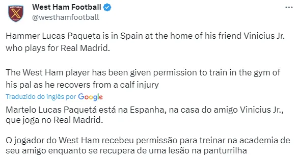 Isso porque, segundo o portal MÁS, Vinicius Jr. está entrando em cena para tentar levar ao Real Madrid o meia Lucas Paquetá, que vem fazendo um grande trabalho na Premier League.