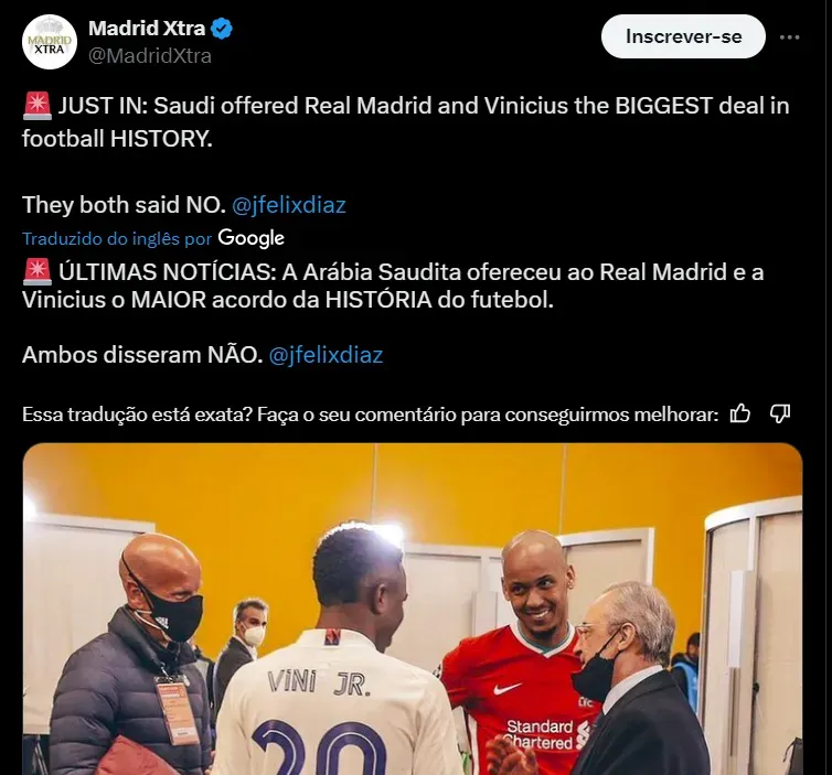 Apesar da surreal proposta, Vinicius Júnior decidiu ficar no Real Madrid, segundo informações do jornal Marca, da Espanha, que conta que o clube merengue também não quis nem ouvir a oferta para vender o camisa 7. O brasileiro iria desembolsar incríveis R$ 1,2 bilhão por ano, mas rejeitou a proposta.