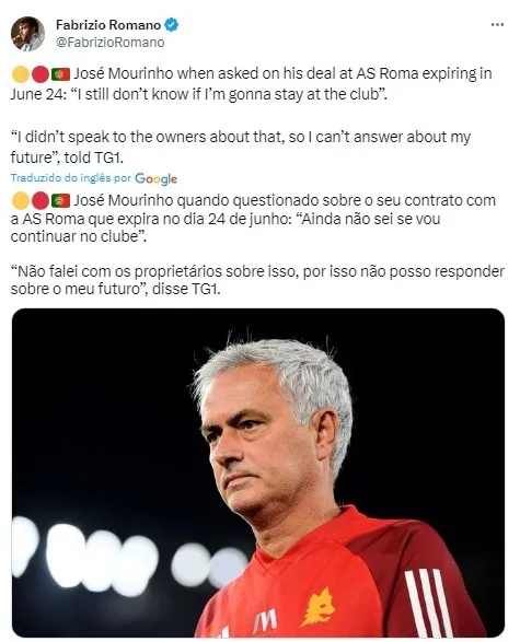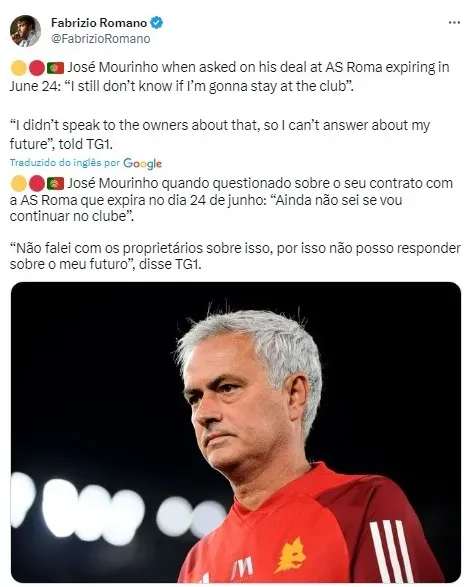 Segundo informações, Mourinho tem contrato com a Roma até 2024, mas ainda não há definição sobre sua continuidade na equipe. O treinador não descartou a possibilidade de deixar o clube, afirmando que ainda não iniciou conversas com os proprietários sobre seu futuro.