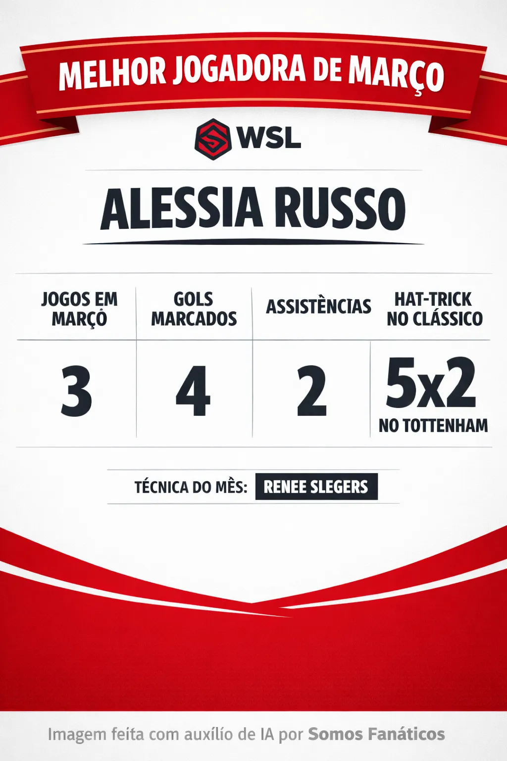 Russo teve participação em gols nos 3 confrontos, marcando contra West Ham e servindo assistência contra o London City. O destaque principal fica para o clássico do Norte de Londres, onde a atacante anotou um hat-trick na goleada por 5 a 2.