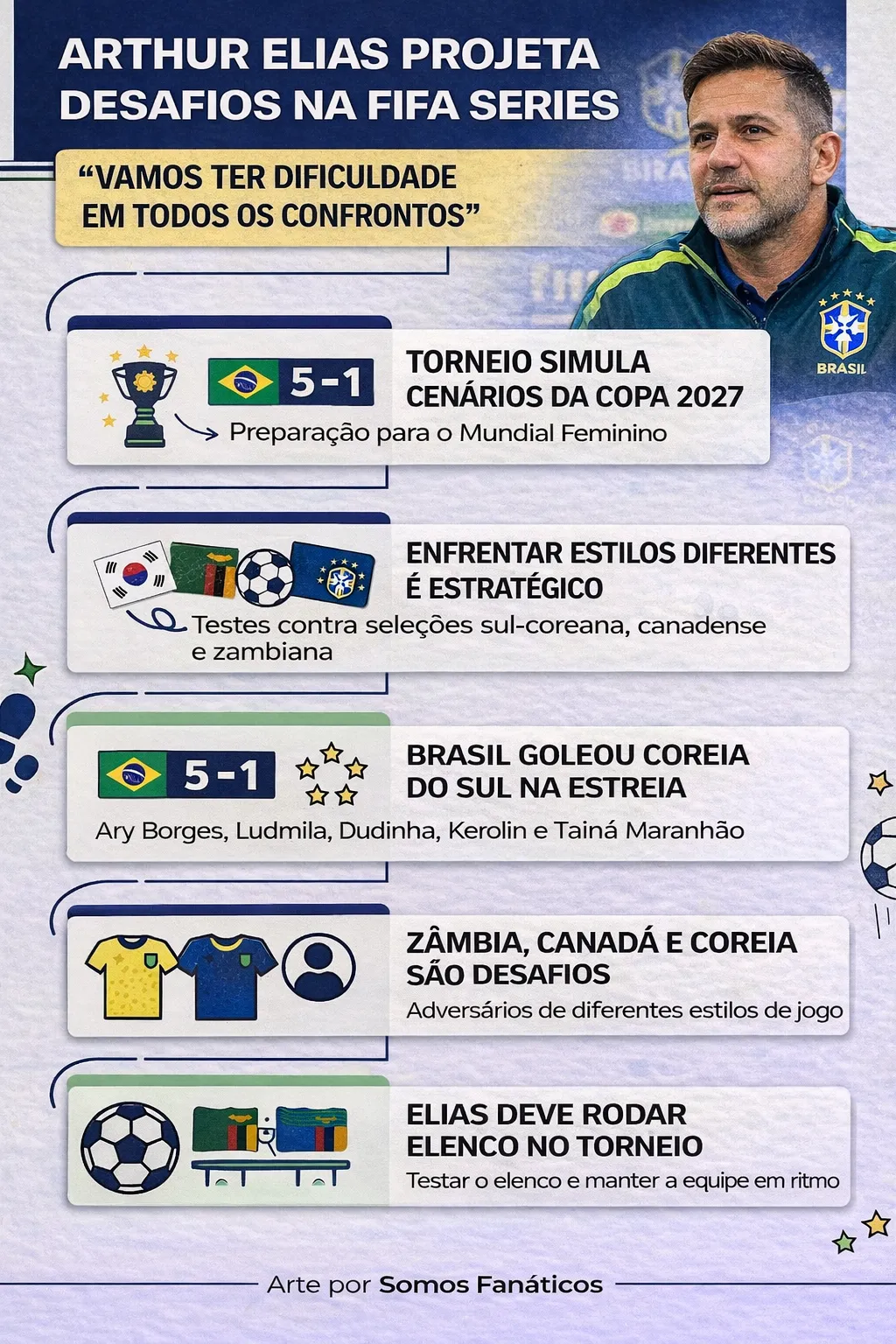 O treinador da Seleção Brasileira Feminina, Arthur Elias, comentou em entrevista na CBF TV sobre a disputa da FIFA Series, na qual o Brasil já disputou a primeira rodada, vencendo a Coréia do Sul em placar de 5 a 1, com destaque para atuações de Kerolin e Tainá Maranhão, confira abaixo as palavras do treinador: