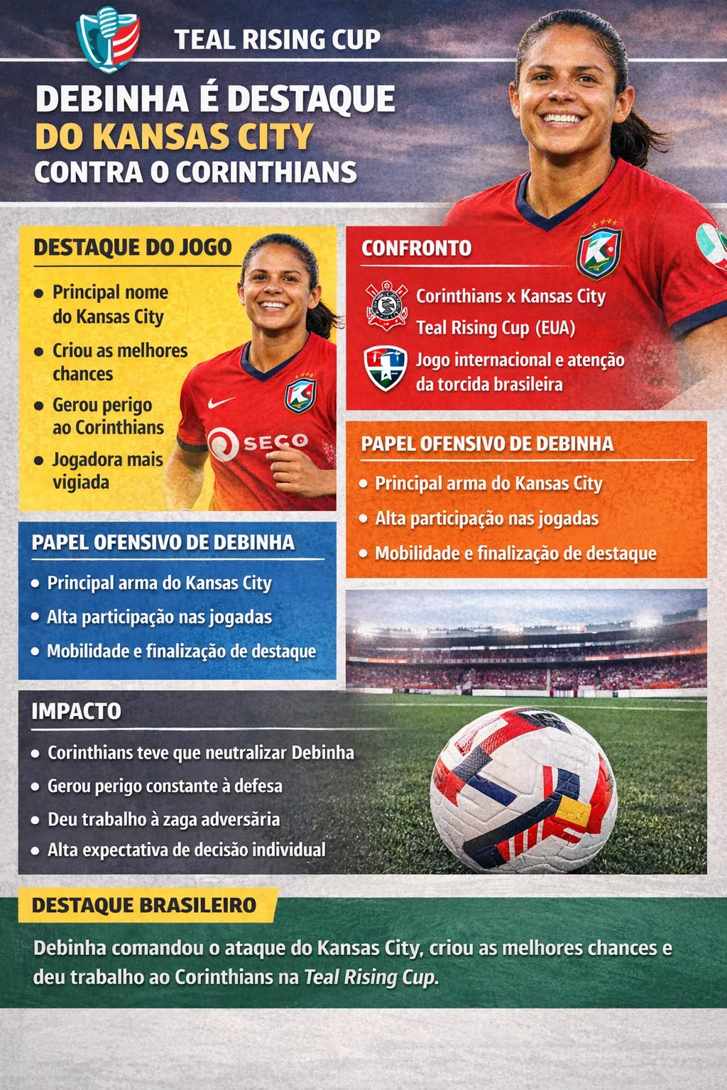 Na última quinta-feira (9), o Kansas City Current, da brasileira Debinha, enfrentou o Corinthians pela semifinal da Teal Rising Cup. Então, a atleta fez uma excelente atuação e novamente se mostra como uma jogadora importante para o clube e segue brigando por vaga na Seleção Feminina.