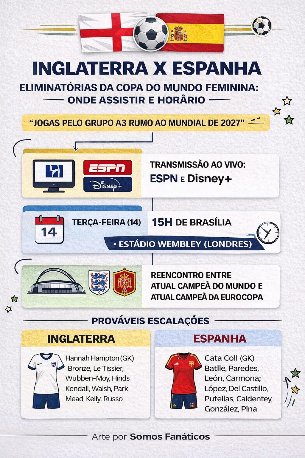 O jogo entre Inglaterra e Espanha terá transmissão ao vivo pelos canais ESPN e Disney+, nesta terça-feira (14), às 15h da tarde, no horário de Brasília. A partida é válida pela terceira rodada do Grupo A3 das Eliminatórias Europeias para a Copa do Mundo Feminina de 2027, sediada no Brasil.