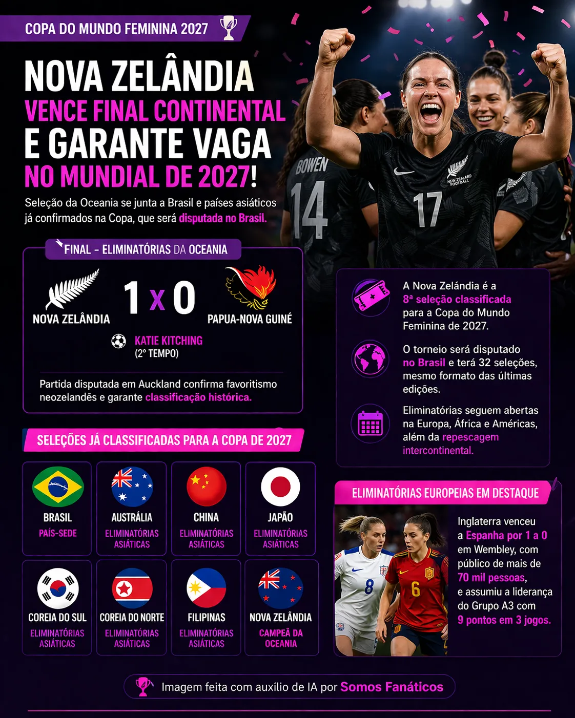 A Nova Zelândia está classificada para a Copa do Mundo Feminina de 2027, que será disputada no Brasil. A vaga foi confirmada na última terça-feira (14), após vitória por 1 a 0 sobre a Papua-Nova Guiné, na decisão das Eliminatórias da Oceania. Com o resultado, a seleção se tornou a oitava equipe garantida no torneio.