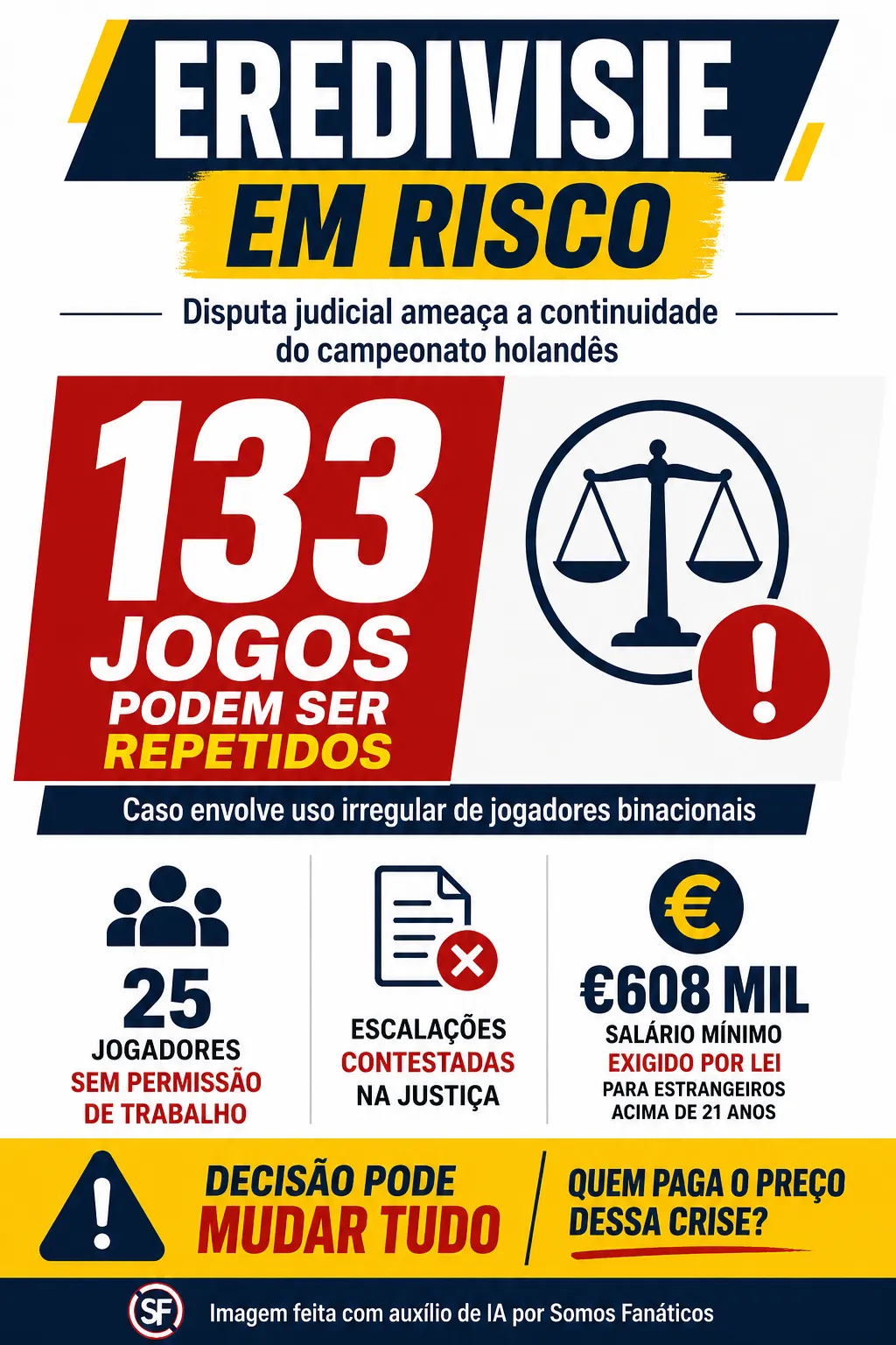 A Eredivisie pode enfrentar um cenário extremo devido à questão jurídica envolvendo jogadores binacionais. Até 133 partidas podem ser contestadas e repetidas, afetando a conclusão do campeonato holandês, conforme o L’Équipe. O NAC Breda foi responsável por recorrer contra uma escalação considerada irregular.