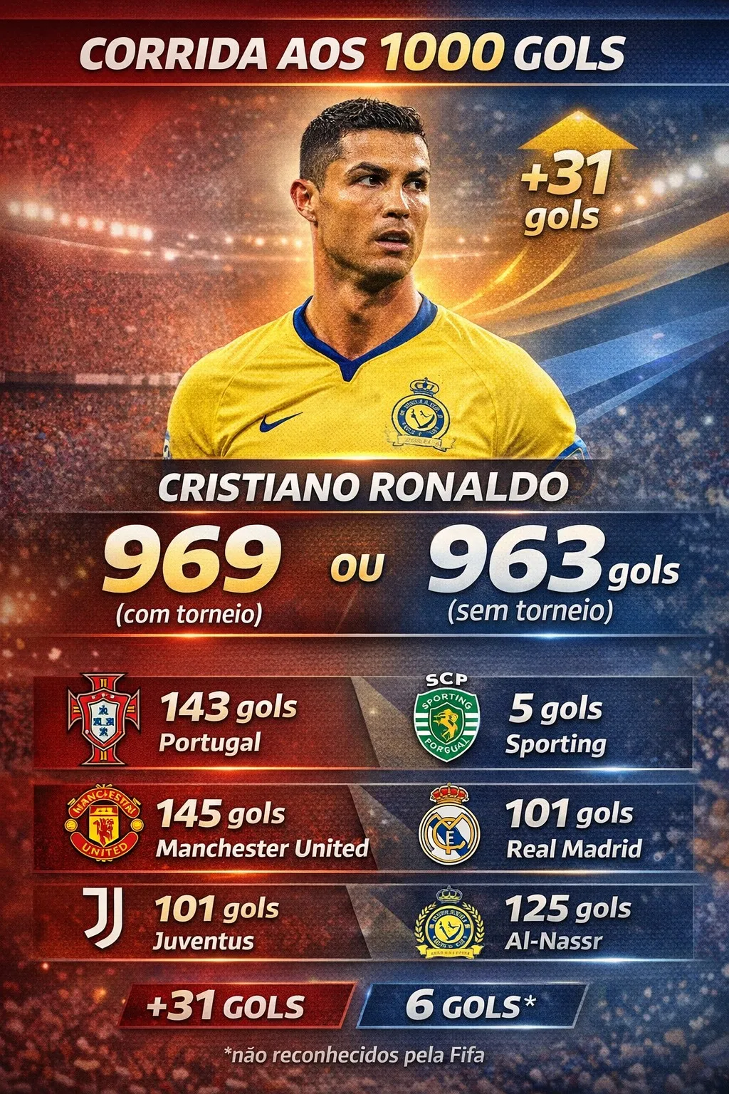 Portanto, existem duas linhas de contagem para os gols de CR7, com os 969 gols, incluindo os seis marcados na competição, ou 963 gols, que desconsidera essas partidas.