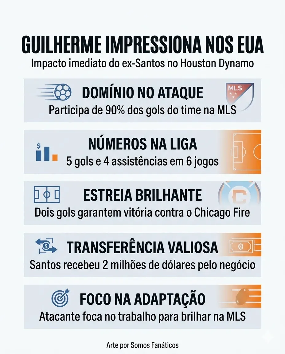 O atacante Guilherme, ex-Santos, domina os números e participa de 90% dos gols do Houston Dynamo na Major League Soccer (MLS), com cinco gols e quatro assistências em seis jogos na liga norte-americana, segundo o site OGOL.