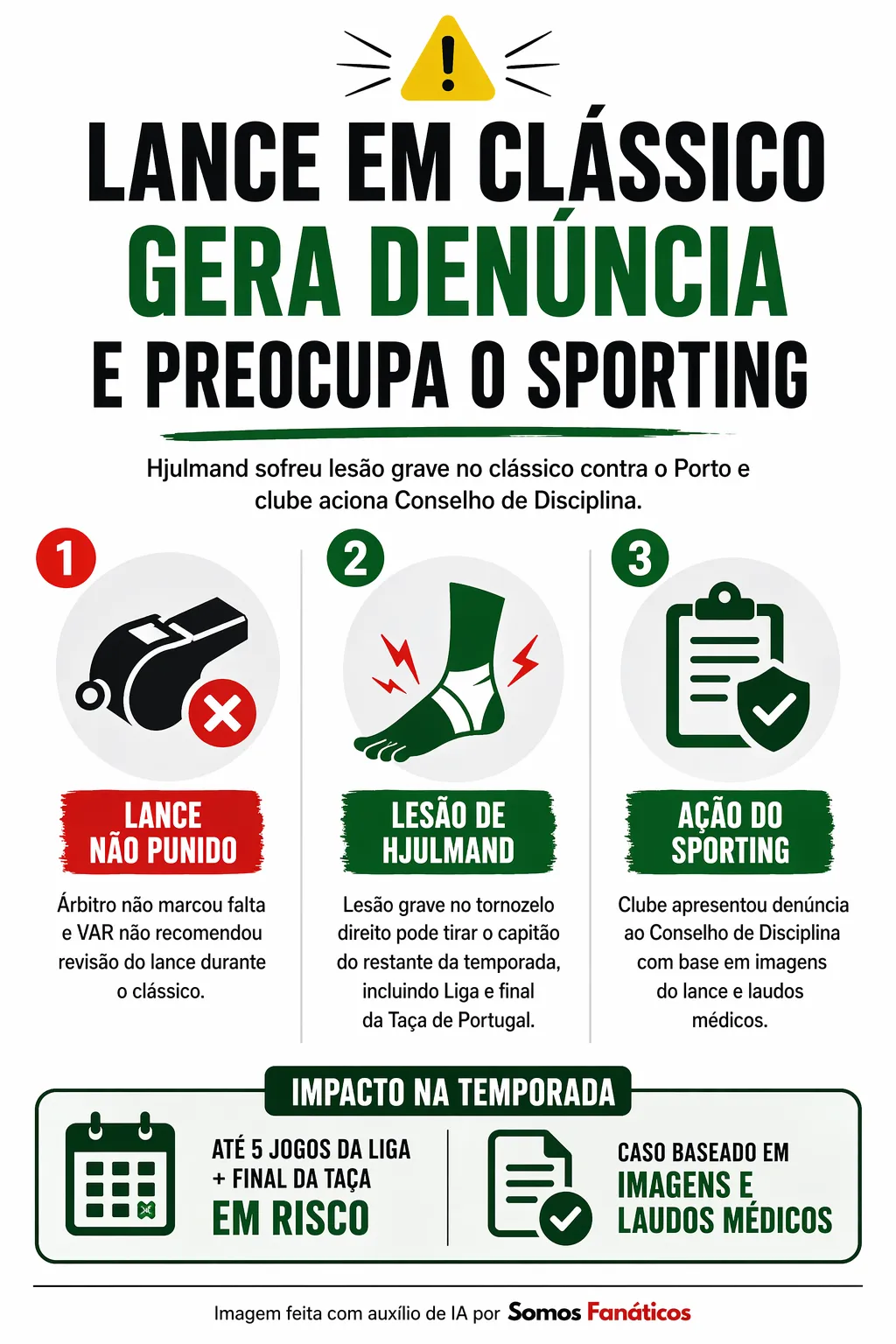 O caso passa agora a ter desdobramentos disciplinares, enquanto o Sporting acompanha a evolução clínica de Hjulmand em meio à reta final decisiva da temporada.