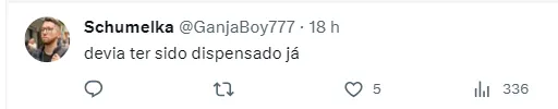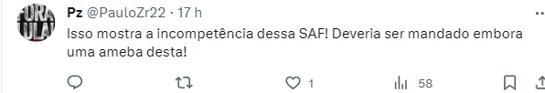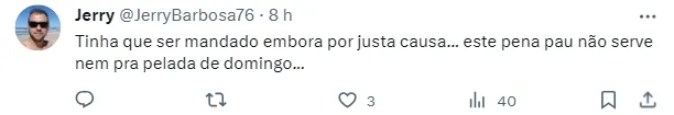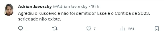 “Achei que nunca mais ia voltar” , “Meu, Nosso Coritiba virou várzea” , “Essa p* não jogou nada desde que chegou” , “Por essas e outras que perdi a esperança nessa SAF. Inexplicável esse cara ainda estar aqui.” , “Absurdo sem fim!”, escreveram alguns torcedores no Twitter.