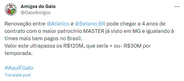 A equipe já começa a planejar seu futuro para a temporada de 2024. As perspectivas são positivas para os torcedores atleticanos, uma vez que o clube renovou seu contrato com o patrocinador master, a Betano, de acordo com informações da Rádio Itatiaia. Este novo acordo renderá ao Galo cerca de R$ 120 milhões e tem validade até 2027, ou seja, quatro anos de parceria sólida.