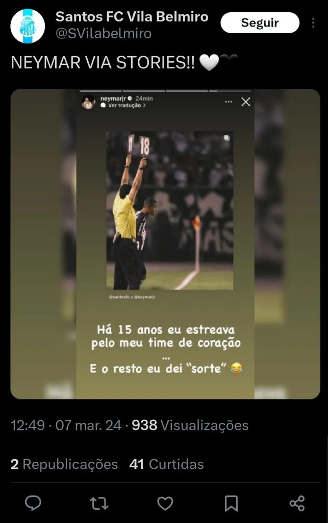 Neste dia 7 de março de 2024, passados 15 anos da estreia de Neymar pelo profissional do Santos, o astro brasileiro apareceu com recado através das redes sociais, especialmente em provocação aos críticos e hates.