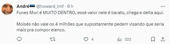 Funes Mori está com 32 anos de idade e tem contrato com o Monterrey até o meio de 2024. Entretanto, para ser liberado de forma imediata, custaria cerca de 2,5 milhões de dólares.