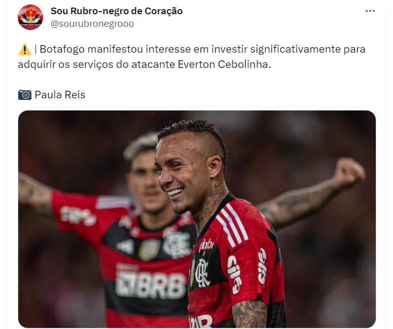 De olho na situação em que se encontra o atacante do Flamengo, o Botafogo é um dos clubes interessados no futebol de Everton Cebolinha. O Glorioso sempre demonstrou interesse no jogador, desde os tempos do Benfica, e tentou competir com o rival carioca naquela oportunidade, mas acabou perdendo a disputa. O interesse, no entanto, continua, e um acordo para 2024 pode acontecer, como informa o portal ‘Sou Rubro-negro de coração’.