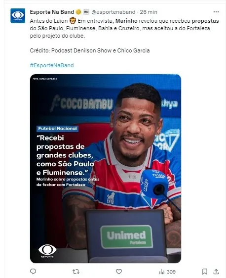 Em uma entrevista ao “Podcast Denílson Show”, o atacante Marinho, atualmente vestindo a camisa do Fortaleza, revelou ter recebido propostas de renomados clubes brasileiros, antes de decidir-se pelo Leão.