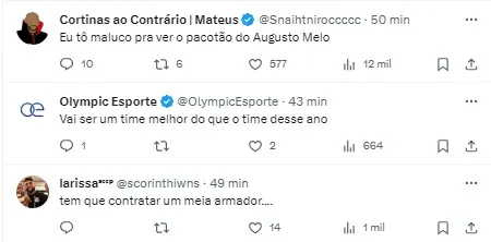 Mano quer discutir o assunto com o presidente Augusto Melo quem ficará no elenco para então, montar posições que precisa para contratar. Há posições que precisam de mais atenção, como zaga e lateral. É consenso dentro do clube que vai atrás de um zagueiro e outro lateral-esquerdo e ao menos um lateral-direito, segundo o portal.