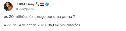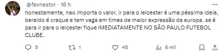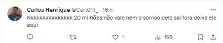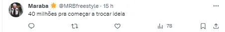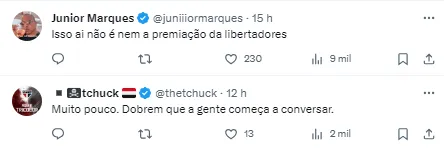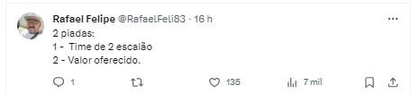“Muito pouco o valor” , “Os 20 milhões é o preço por uma perna? , “Isso não é nem premiação da Libertadores “ , “Muito pouco. Dobrem e a gente começa a conversar” , “Esse valor é pela perna direita só né?” , “Beraldo vale mais!”, escreveram.