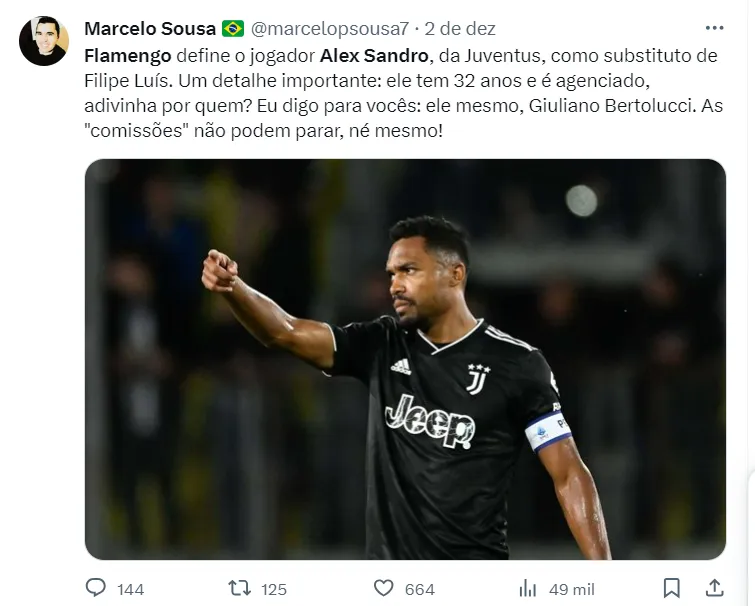 Na lateral-esquerda, com a saída anunciada de Filipe Luís, o técnico Tite tem em mente Alex Sandro, que está em fim de contrato com a Juventus, da Itália, como um possível reforço.