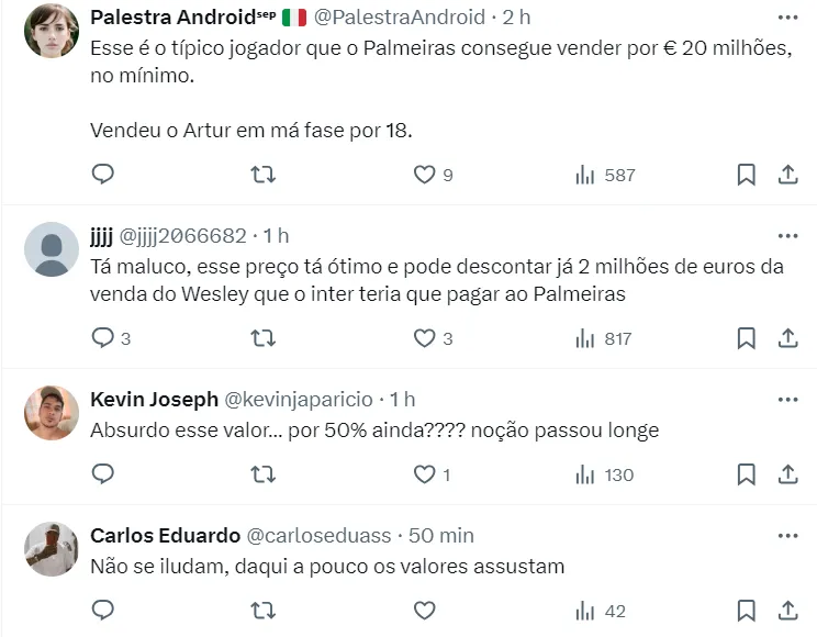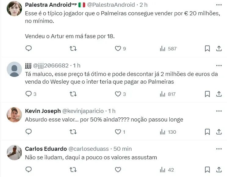 O Internacional, segundo informações do portal GOAL, pede R$ 42 milhões pelo percentual do atleta – cerca de 50%. O Verdão está ciente do valor e tentará diminuir esse montante.