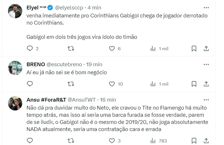 Na web, a torcida do Corinthians parece não acreditar muito na declaração de Neto, apesar do futebol europeu ter fortes olhares para o futebol de Yuri Alberto e Gabigol estar em baixa no Mengão.