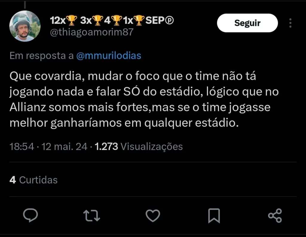 “O problema não é Barueri, o problema é não podermos jogar em casa. Não quero outra segunda casa, o problema é o Allianz Parque. Se não jogamos no Allianz Parque, não nos cobrem para ser campeões“, completou o português.