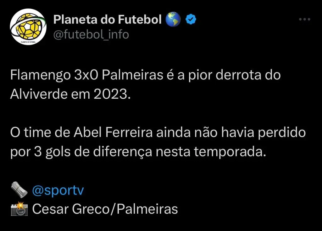 “Depois de uma temporada desgastante, depois de tantos jogos, agora, entrando em uma fase crucial, vamos parar quase 15 dias. É uma falta de organização absurda. Vamos jogar no sábado e depois vamos parar quase 15 dias. Sinceramente, eu não entendo, tenho muita dificuldade em aceitar, mas sempre foi assim. Estamos a 5 jogos do fim do campeonato e temos uma parada de quase 15 dias. Dou a minha opinião para uma melhoria, se não quiserem ouvir não tem problema nenhum.” afirmou Abel Ferreira.