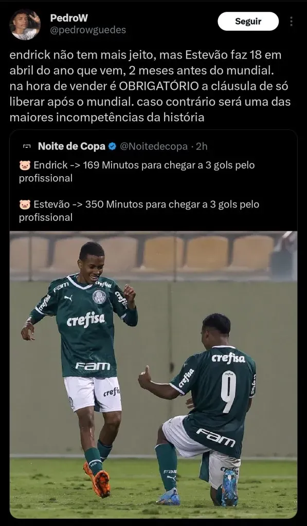 Apesar de passar em branco, Endrick teve um papel importante na criação de chances para a equipe ao longo da partida. Estevão, além de ter uma boa atuação, foi coroado com um gol após sofrer pênalti, que ele mesmo acabou cobrando.