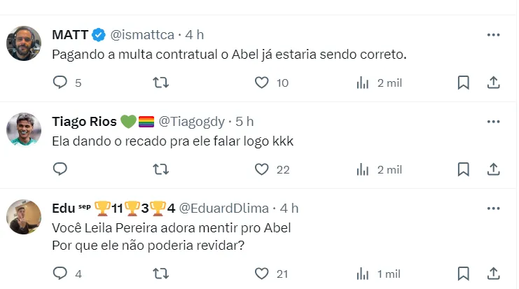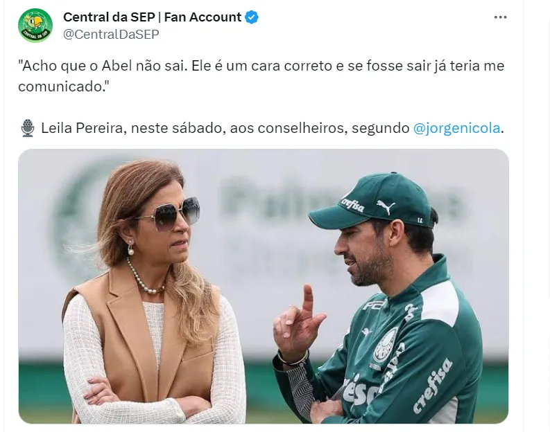 “Acho que o Abel não sai. Ele é um cara correto e se fosse sair já teria me comunicado”, teria dito Leila, conforme informações de Jorge Nicola.