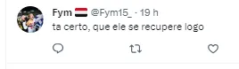 “Difícil dar uma previsão, mas acredito que uns 15 dias. Mas vamos trabalhar firme e forte. Estou trabalhando em três períodos para logo estar de volta“, explicou o jogador.