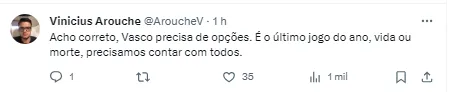 Na última partida, nesta quarta-feira (6), o time recebe o Red Bull Bragantino, em São Januário, às 21h30 (de Brasília) para garantir sua permanência na elite do futebol brasileiro.