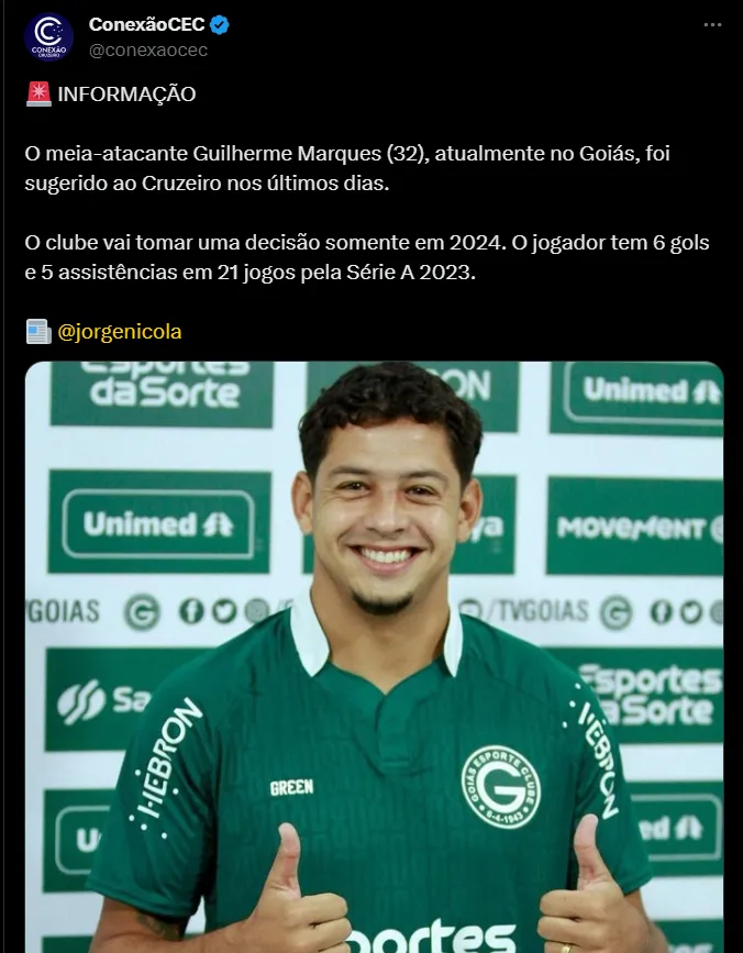 De acordo com as informações publicadas pelo jornalista Jorge Nicola, o atacante Guilherme Marques, que está no Goiás, foi sugerido para o Cruzeiro nos últimos dias e pode ser um reforço para o próximo ano.