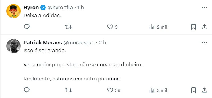 O primeiro contato já aconteceu diante da diretoria do Flamengo, que colocou na mesa algumas exigências para um eventual acerto, o que seria uma grande surpresa, já que Flamengo e Adidas têm contrato em vigor.
